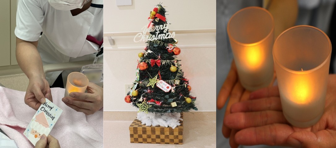 クリスマスといえば、恒例行事となった大阪病院附属看護学校の学生達によるキャンドルサービスです。看護学生がクリスマスソングを歌いながら、病棟を巡り、入院中の患者さんにクリスマスカードを手渡しました。