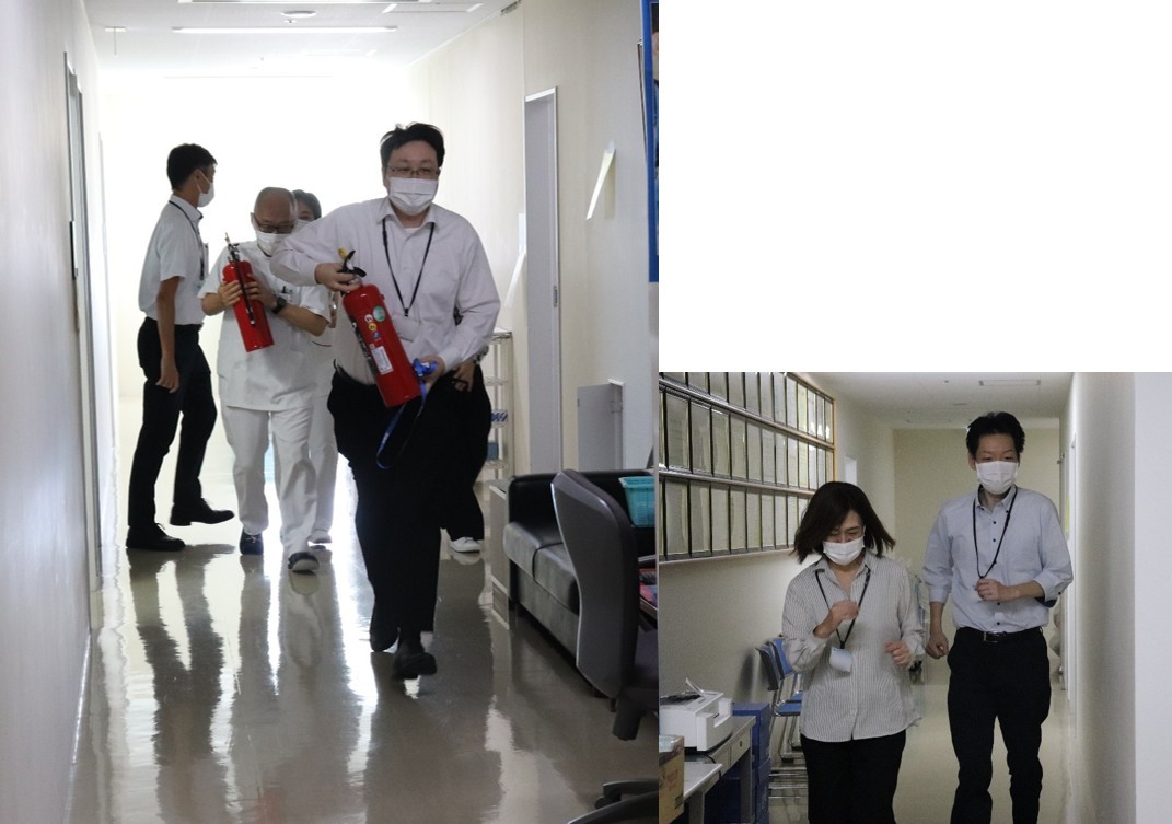 事務部門エリアにある給湯室より火災が発生したと想定し、幹部、看護部と情報共有しながら、消防隊への通報を行います。各々、消火部隊と避難部隊に分かれて、取り組みました。