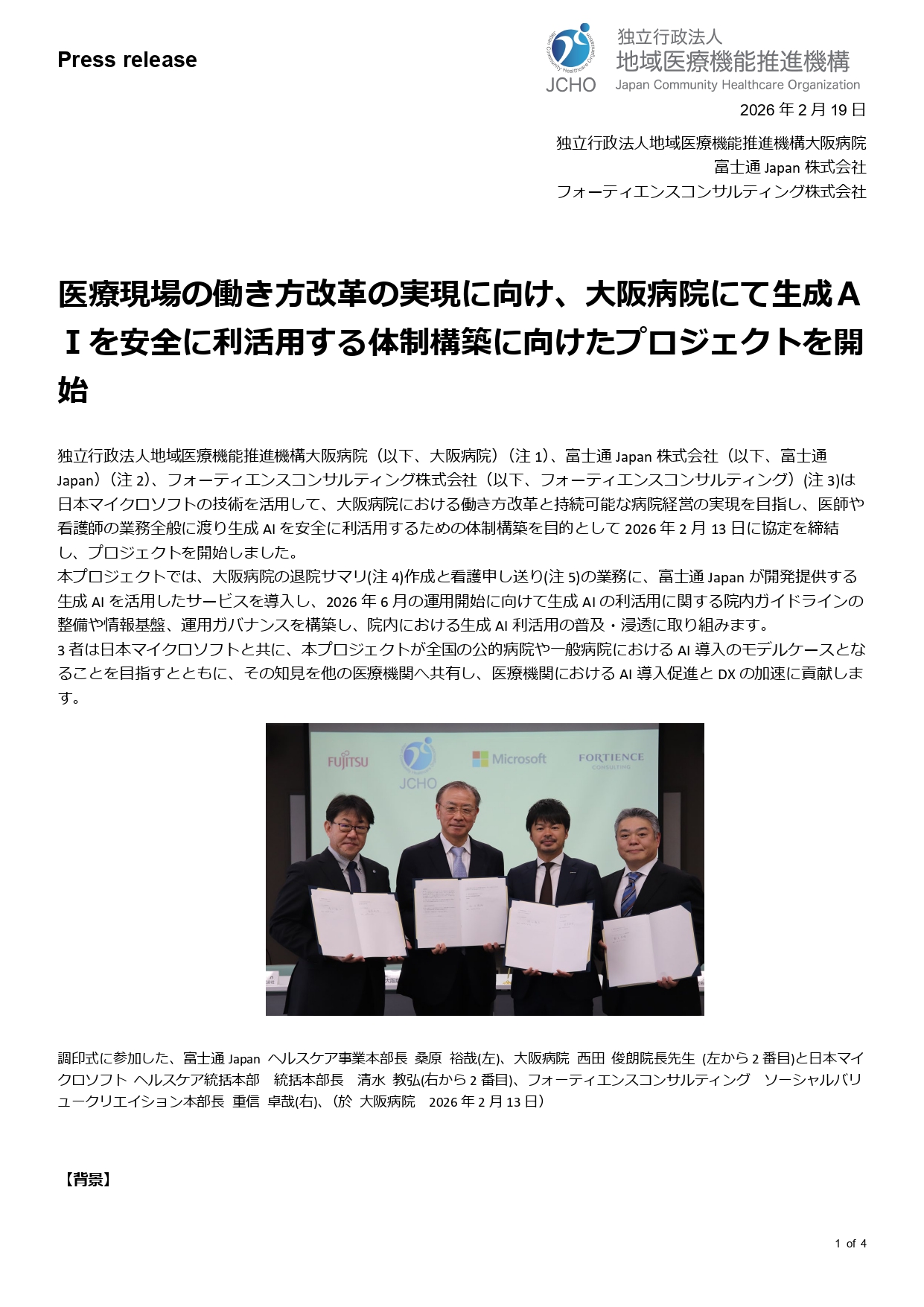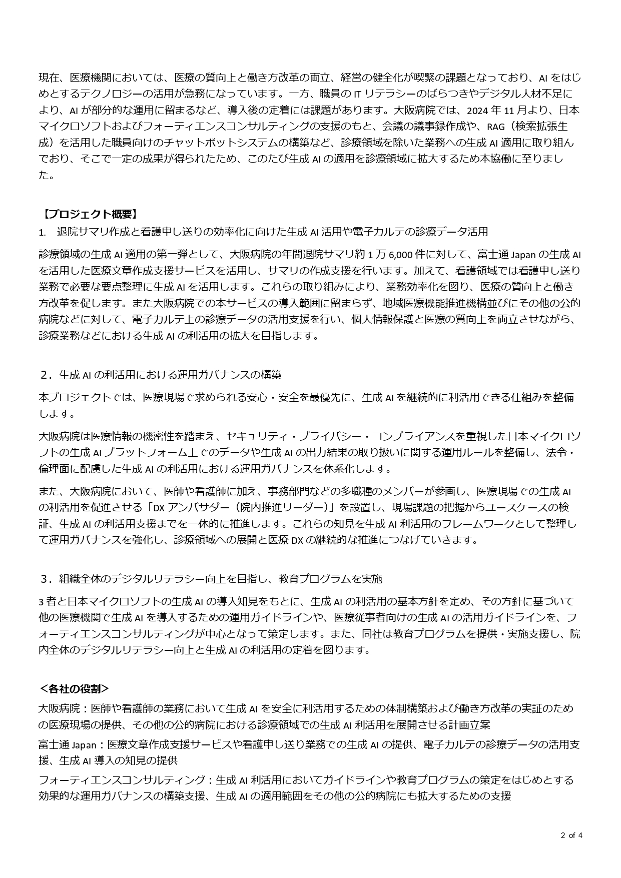 医療現場の働き方改革の実現に向け、大阪病院にて生成AIを安全に利活用する体制構築に向けたプロジェクトを開始いたします。